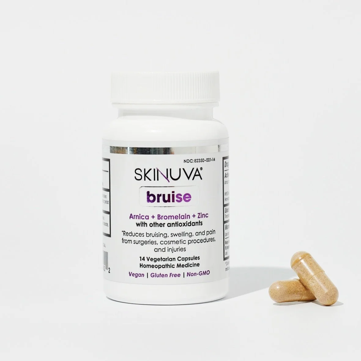 Skinuva Bruise - an FDA-registered, homeopathic Arnica supplement that helps reduce bruising, swelling, and pain from surgeries, cosmetic procedures, and injuries. Skinuva Bruise can be taken the night before the procedure. Dosage is usually 1 capsule twice daily for 7 days unless prescribed differently by Dr. Mettu.